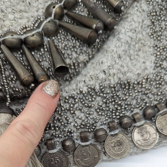 Anthropologie IbBan Gray Beaded Crossbody Kona Clutch Coin Beads Tassels Boho