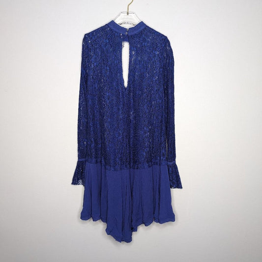 Free People Blue Tell Tale Tunic Dress Long Sleeve Sheer Lace Cutouts High Neck