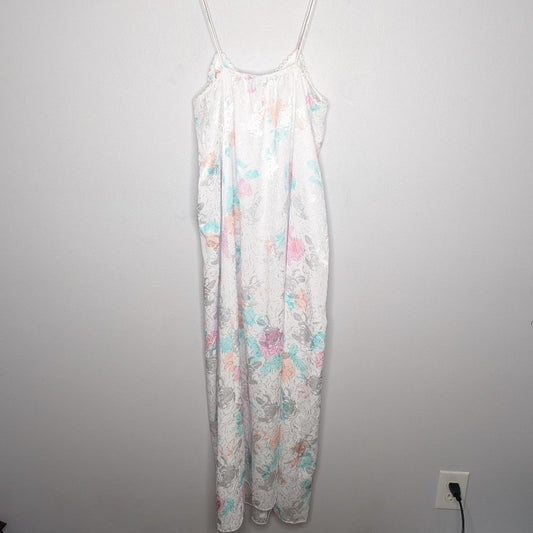 Mary McFadden Vintage White Satin Floral Print Maxi Slip Dress Nightgown Size M