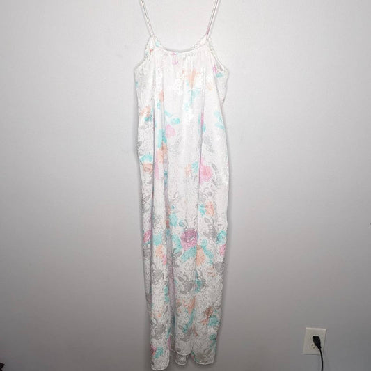 Mary McFadden Vintage White Satin Floral Print Maxi Slip Dress Nightgown Size M