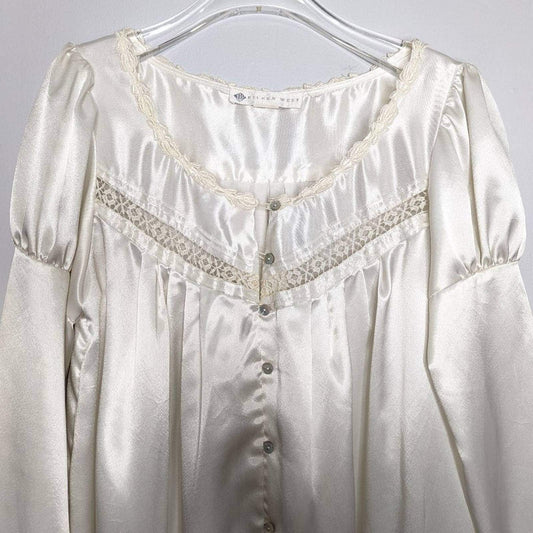 Eileen West Vintage White Satin Nightgown Long Sleeve Button Front Lace Trim 80s