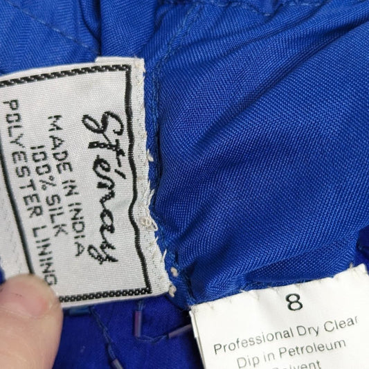 Vintage Stenay Blue Beaded Midi Silk Skirt Scalloped Edge Back Slit Size 8