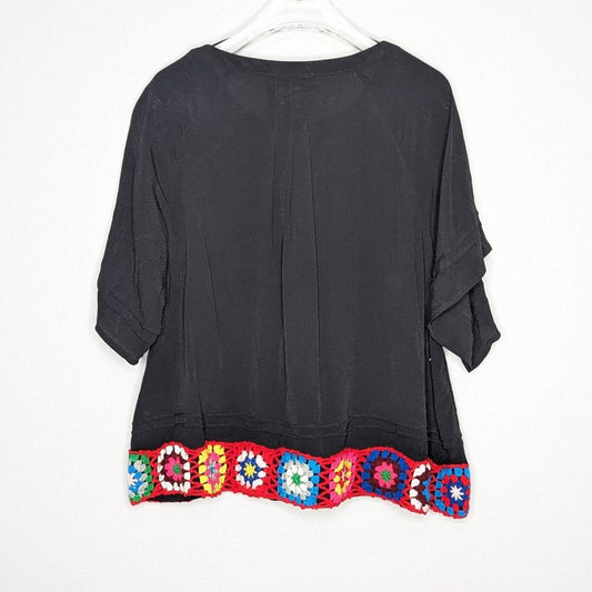 Central Park West NY Black Knit Granny Square Trim Blouse Short Sleeve Tie Neck