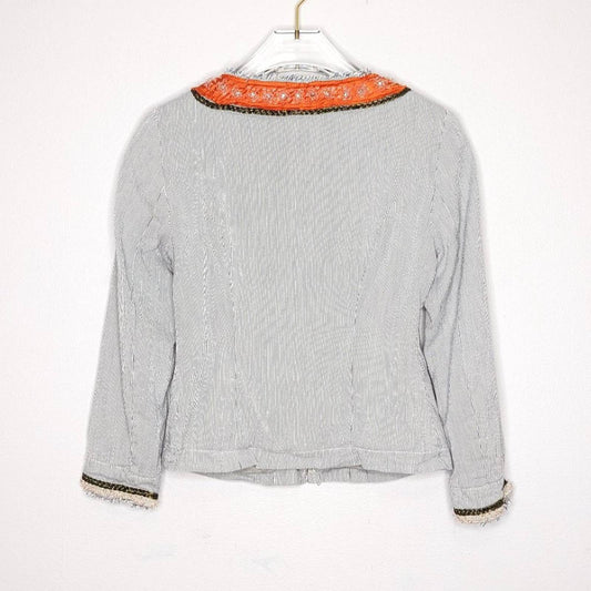 Free People Vintage White Blue Striped Cropped Jacket Beaded Rhinestones Size 0