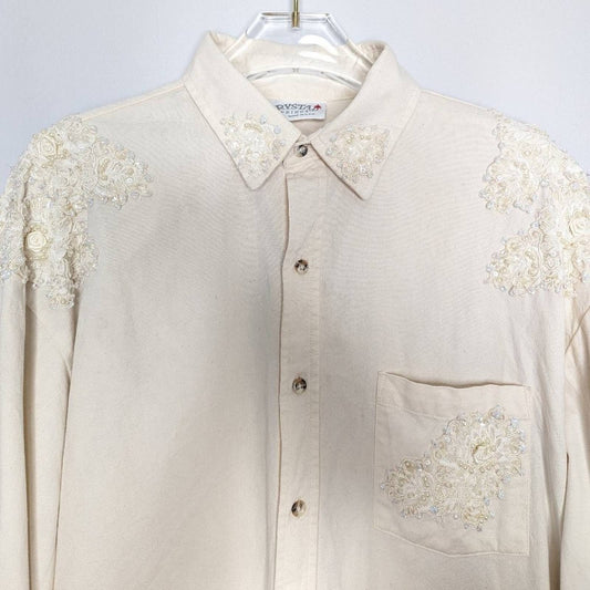 Crystal Springs Vintage Cream Long Sleeve Button Up Lace Appliqué Pearls Glitter