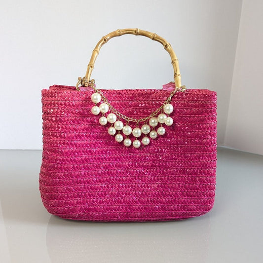Vintage Hot Pink Woven Bag Bamboo Handles Upcycled Jewelry Charms Pearls Flower