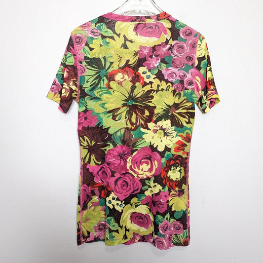 Vintage Y2k Pink Green Floral Print Short Sleeve Lightweight Crew Neck Top M