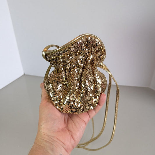 Whiting And Davis Vintage Gold Mesh Mini Drawstring Bucket Bag Disco Metallic
