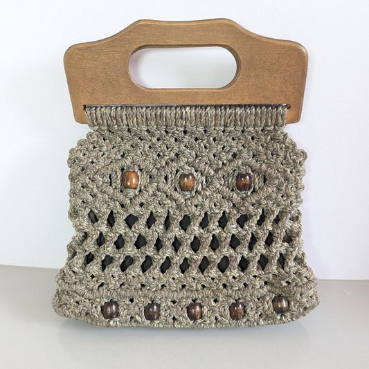 Vintage Taupe Macrame Bag Double Wooden Handle Upcycled Jewelry Charms Shells