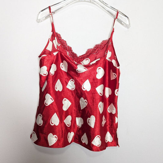 Vintage Y2K Red Satin Heart Print Cami Lace Trim Spaghetti Straps V-Neck Size M