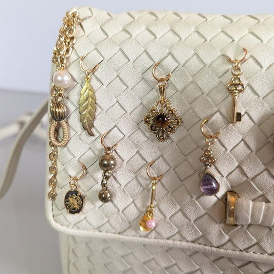Vintage Cream Woven Ganson Crossbody Bag Upcycled Jewelry Charms Hearts Flowers