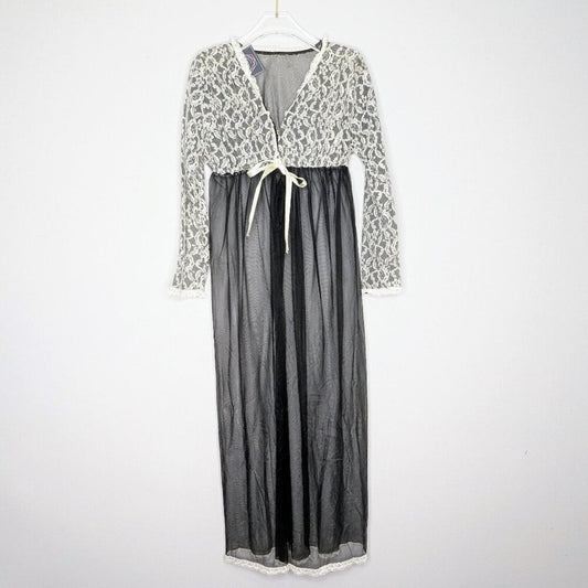 Vintage 1970's Sheer Black White Lace Nightgown And Robe Set Long Sleeve V-Neck