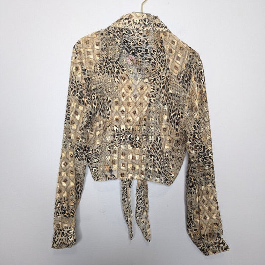 Vintage 90's Animal Print Long Sleeve Tie Front Shirt Collared Leopard Metallic