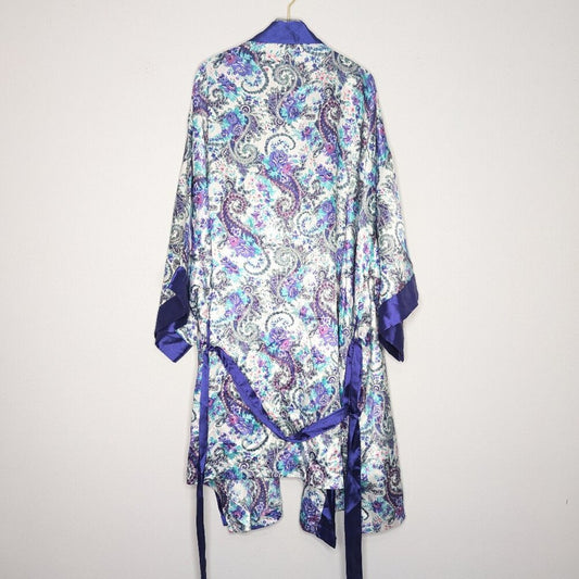 Vintage 80's Purple Floral Paisley Long Sleeve Tie Waist Robe Satin Pockets