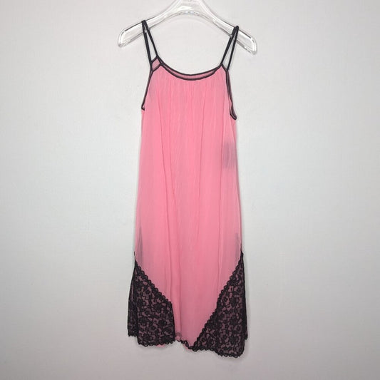 Vintage 60's Bright Pink Nightgown Black Lace Trim Spaghetti Straps Berkliff